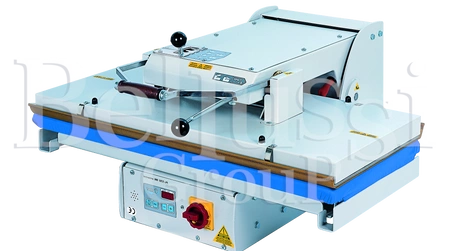 Professionelle Hand-Thermokupplungsmaschine Comel PL/T 900 mit einer Arbeitsplatte von 90 x 40 cm. Ausgestattet mit manueller Einstellung der Schließkraft und einem elektronischen Thermostat zur Regulierung der Temperatur der Platine und des Klebezeitpunkts. Es verfügt über eine Vorrichtung, die vor versehentlichem Schließen der Platte für mehr Arbeitssicherheit schützt.